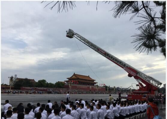 此外,為滿足各種拍攝條件,央視還精選了中聯(lián)重科56米泵車和32米云梯消防車。56米泵車可謂是大號(hào)“攝像搖臂”,在其臂架前端架設(shè)攝像機(jī)輔助拍攝閱兵隊(duì)伍行進(jìn)的動(dòng)態(tài)長(zhǎng)鏡頭。32米云梯消防車則是超高的“拍攝平臺(tái)”,央視的“長(zhǎng)頸鹿攝像機(jī)”架設(shè)在高度32米的消防平臺(tái)上,攝像師站在平臺(tái)上捕捉受閱裝備彎道轉(zhuǎn)彎的精彩畫面,體現(xiàn)鋼鐵洪流卷起滾滾烽煙。在前期,云梯消防車還承擔(dān)了輔助架設(shè)“天鷹”的重任。