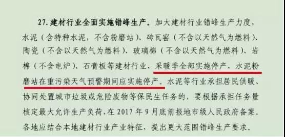 近日,環(huán)保部發(fā)布《京津冀及周邊地區(qū)2017-2018 年秋冬季大氣污染綜合治理攻堅行動方案》,2017年10月至2018年3月,水泥(含特種水泥,不含粉磨站)、磚瓦窯(不含以天然氣為燃料)、陶瓷(不含以天然氣為燃料)、玻璃棉(不含以天然氣為燃料)、巖棉(不含電爐)、石膏板等建材行業(yè),采暖季全部實施停產(chǎn),水泥粉磨站在重污染天氣預(yù)警期間應(yīng)實施停產(chǎn)。