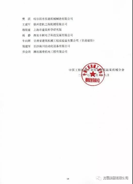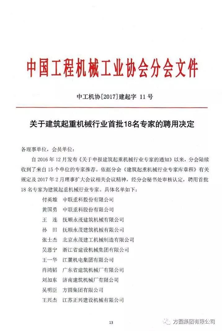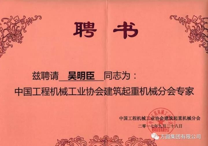 在11月9日召開(kāi)的中國(guó)工程機(jī)械工業(yè)協(xié)會(huì)建筑起重機(jī)械分會(huì)年會(huì)上,以中工機(jī)協(xié)【2017】建起字11號(hào)文件公布了《關(guān)于建筑起重機(jī)械行業(yè)首批18名專(zhuān)家的聘用決定》,聘用首批18名專(zhuān)家為建筑起重機(jī)械行業(yè)專(zhuān)家,方圓集團(tuán)副總工程師吳明臣名列其中。