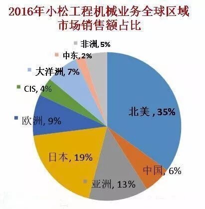 盡管每年有大筆收入來(lái)自中國(guó),但小松工程機(jī)械業(yè)務(wù)最大的市場(chǎng)其實(shí)是北美,銷(xiāo)售額占比35%;中國(guó)銷(xiāo)售占比只有6%,還不如日本本土——19%。