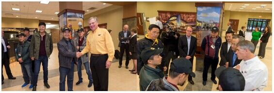 美國中部時間11月11日上午,Cat鋼鐵英雄爭霸賽盟主一行抵達(dá)卡特彼勒公司坐落于奧羅拉市的Cat裝載機(jī)工廠,展開為期兩天的卡特彼勒公司參觀訪問。隨后,盟主們輾轉(zhuǎn)皮奧里亞市,重溫卡特彼勒百年輝煌之路,訪問了生產(chǎn)推土機(jī)的卡特彼勒東皮奧里亞工廠和卡特彼勒的訪客中心,并在美國中部時間12日下午抵達(dá)愛德華茲演示與學(xué)習(xí)中心,通過遙控駕駛體驗(yàn)了Cat D11T大型推土機(jī)。傍晚時分,卡特彼勒董事長兼首席執(zhí)行官道格拉斯?歐博赫曼與其他公司全球高層熱烈歡迎各位盟主的到來,并認(rèn)真傾聽了他們對Cat產(chǎn)品設(shè)備的訴求。