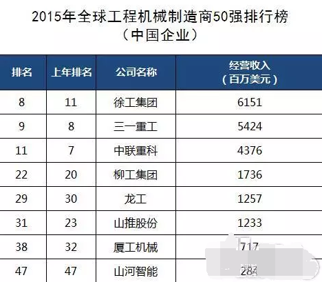 2015年全球工程機(jī)械制造商50強(qiáng)排行榜中國企業(yè)榜單