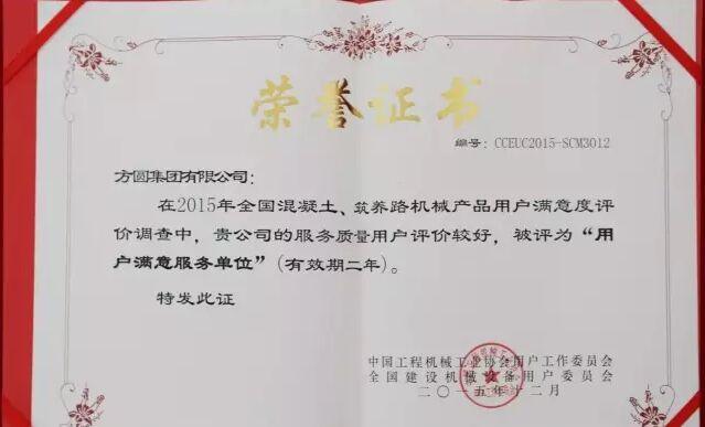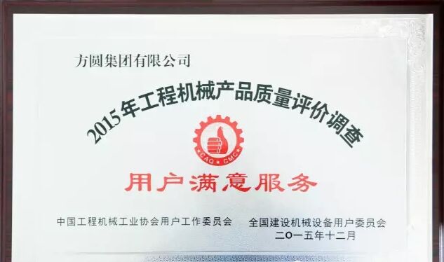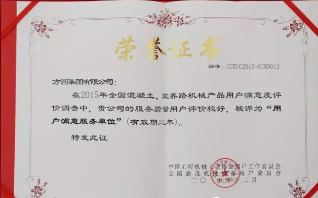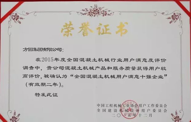 此外,因為方圓集團(tuán)在2015年度全國混凝土機(jī)械行業(yè)用戶滿意度評價調(diào)查中,受到廣大用戶的一致好評,被授予“全國混凝土機(jī)械用戶滿意十強(qiáng)企業(yè)”稱號。在產(chǎn)品質(zhì)量調(diào)查中,連續(xù)七次被評為“全國用戶滿意單位”。