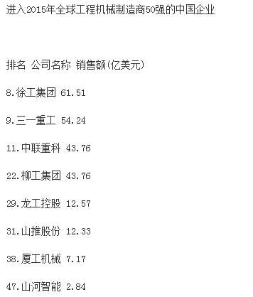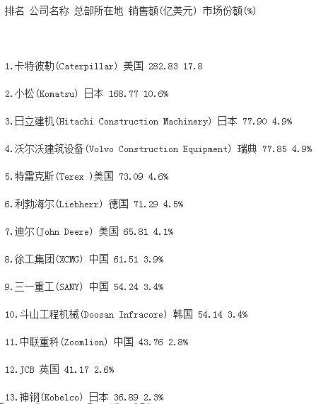 分析指出,受大宗商品價(jià)格下跌、新型經(jīng)濟(jì)體經(jīng)濟(jì)增速減緩和世界經(jīng)濟(jì)不景氣的影響,全球前50家工程機(jī)械制造企業(yè)總產(chǎn)值較上一年度下跌16.2%,達(dá)到1330億美元,創(chuàng)2009年以來新低。據(jù)中國(guó)工程機(jī)械商貿(mào)網(wǎng)編輯了解,2009年,工程機(jī)械行業(yè)一年銷售額下降了1090億美元。自那時(shí)起,工程機(jī)械行業(yè)收入下降趨勢(shì)一直未有改變。報(bào)告同時(shí)強(qiáng)調(diào),榜單上下滑最為嚴(yán)重的是中國(guó)企業(yè),這很大程度上是因?yàn)橹袊?guó)經(jīng)濟(jì)增速的放緩。中國(guó)企業(yè)中,只有徐工集團(tuán)仍然保持在前十強(qiáng),位列榜單第九位?!斑@個(gè)市場(chǎng)趨勢(shì)表現(xiàn)最顯著的就是中國(guó)建筑設(shè)備制造商,相比去年,所有中國(guó)企業(yè)的排名有所下滑。排名前十的企業(yè)中,如今只有徐工一家中國(guó)工程機(jī)械制造廠商?!?/span>
