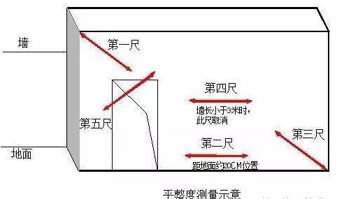 三、表面平整度1、指標(biāo)說(shuō)明:反映層高范圍內(nèi)剪力墻、混凝土柱表面平整程度。2、測(cè)量工具:2米靠尺、楔形塞尺3、測(cè)量方法和數(shù)據(jù)記錄:(1)剪力墻/暗柱:選取長(zhǎng)邊墻,任選長(zhǎng)邊墻兩面中的一面作為1個(gè)實(shí)測(cè)區(qū)。累計(jì)實(shí)測(cè)實(shí)量不少于5個(gè)實(shí)測(cè)區(qū)。(2)當(dāng)所選墻長(zhǎng)度小于3米時(shí),同一面墻4個(gè)角(頂部及根部)中取左上及右下2個(gè)角。按45度角斜放靠尺,累計(jì)測(cè)2次表面平整度??缍纯诓课槐販y(cè)。這2個(gè)實(shí)測(cè)值分別作為該指標(biāo)合格率的2個(gè)計(jì)算點(diǎn)。(3)當(dāng)所選墻長(zhǎng)度大于3米時(shí),除按45度角斜放靠尺測(cè)量?jī)纱伪砻嫫秸韧?,還需在墻長(zhǎng)度中間水平放靠尺測(cè)量1次表面平整度。跨洞口部位必測(cè)。這3個(gè)實(shí)測(cè)值分別作為判斷該指標(biāo)合格率的3個(gè)計(jì)算點(diǎn)。(4)混凝土柱:可以不測(cè)表面平整度。4、示例: