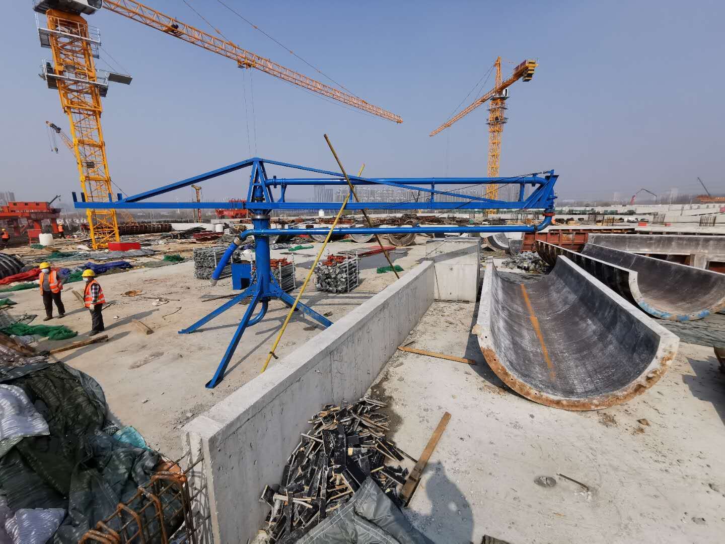 布料機是為了擴大混凝土澆注范圍,提高泵送施工機械化水平而開發(fā)研制的新產(chǎn)品。是混凝土輸送泵的配套設(shè)備,與混凝土輸送泵連接,擴大了混凝土泵送范圍。有效的解決了墻體澆注布料的難題,對提高施工效率,減輕勞動強度,發(fā)揮了重要作用。