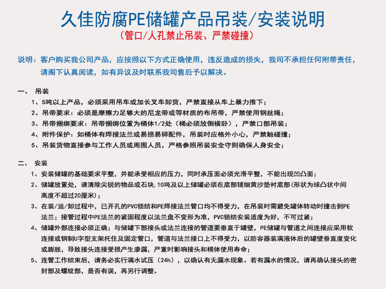 1)產(chǎn)品采用韓國進口高質(zhì)量LLDPE作為產(chǎn)品生產(chǎn)原材料,生產(chǎn)出來的pe儲罐具有無毒、無味、耐酸、耐堿、耐沖擊、耐高溫、耐寒、不易老化等優(yōu)點。