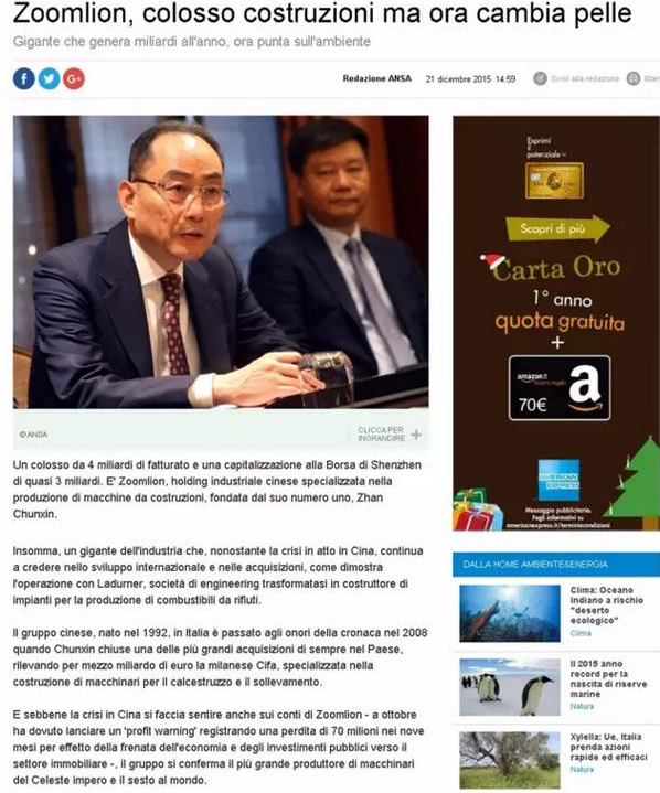 意大利知名國際通訊社安莎通訊社(Agenzia nazionalestampa associata,ANSA)今日在其網站首頁連續(xù)重磅發(fā)布三篇報道,聚焦中國企業(yè)中聯(lián)重科收購意大利領先環(huán)保企業(yè)LADURNER(納都勒)公司,中聯(lián)重科董事長詹純新,公司副總裁、環(huán)境集團總裁張建國接受了安莎社記者的專訪。
